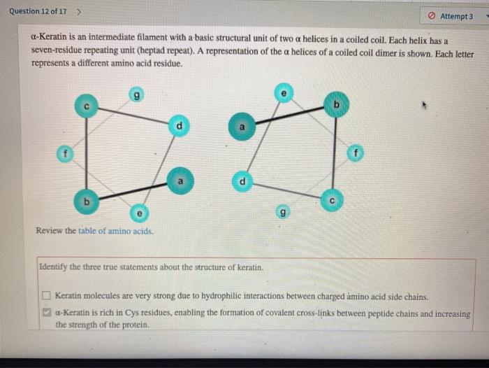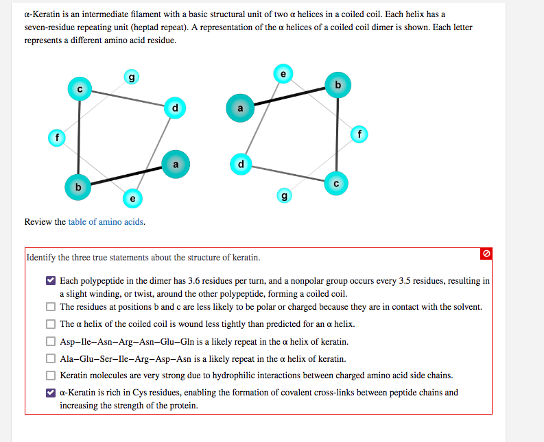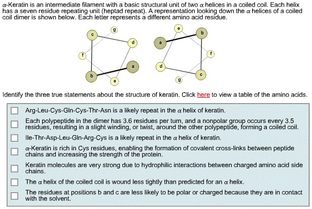 Keratin molecules are very strong due to hydrophilic interactions between charged amino acid side chains The a helix of the coiled coil is wound less tightly than predicted for an a helix Glu-Val-Arg-Asp-Arg-Lys-His is a likely repeat in the a helix of keratin Leu-Lys-Asn-Val-Asp-Glu-Arg is a likely repeat in the a helix of keratin a Keratin is rich in Cys residues enabling the formation of. Identify the three true statements about the structure of keratin. They create the amphipathic helix - with nonpolar residues forming a striple.